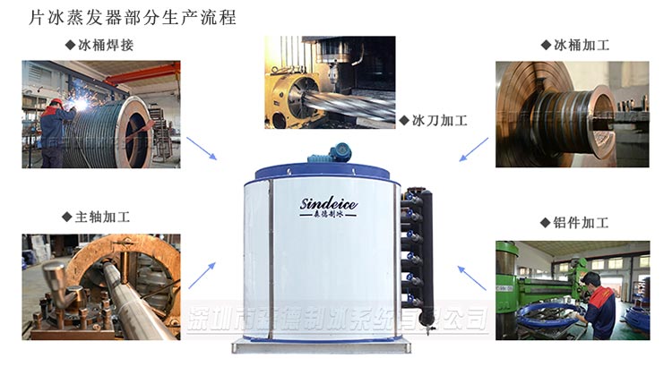 片冰機蒸發器作為片冰機蒸發產冰的組件,是機器產能及產冰質量最重要的部件。森德制冰具備多年的片冰機設計和生產制造經驗,根據客戶的用冰需求,我工廠可單獨代工蒸發器單桶??蛻艨善ヅ渥杂械闹评錂C組,進行安裝調試,滿足生產需求。